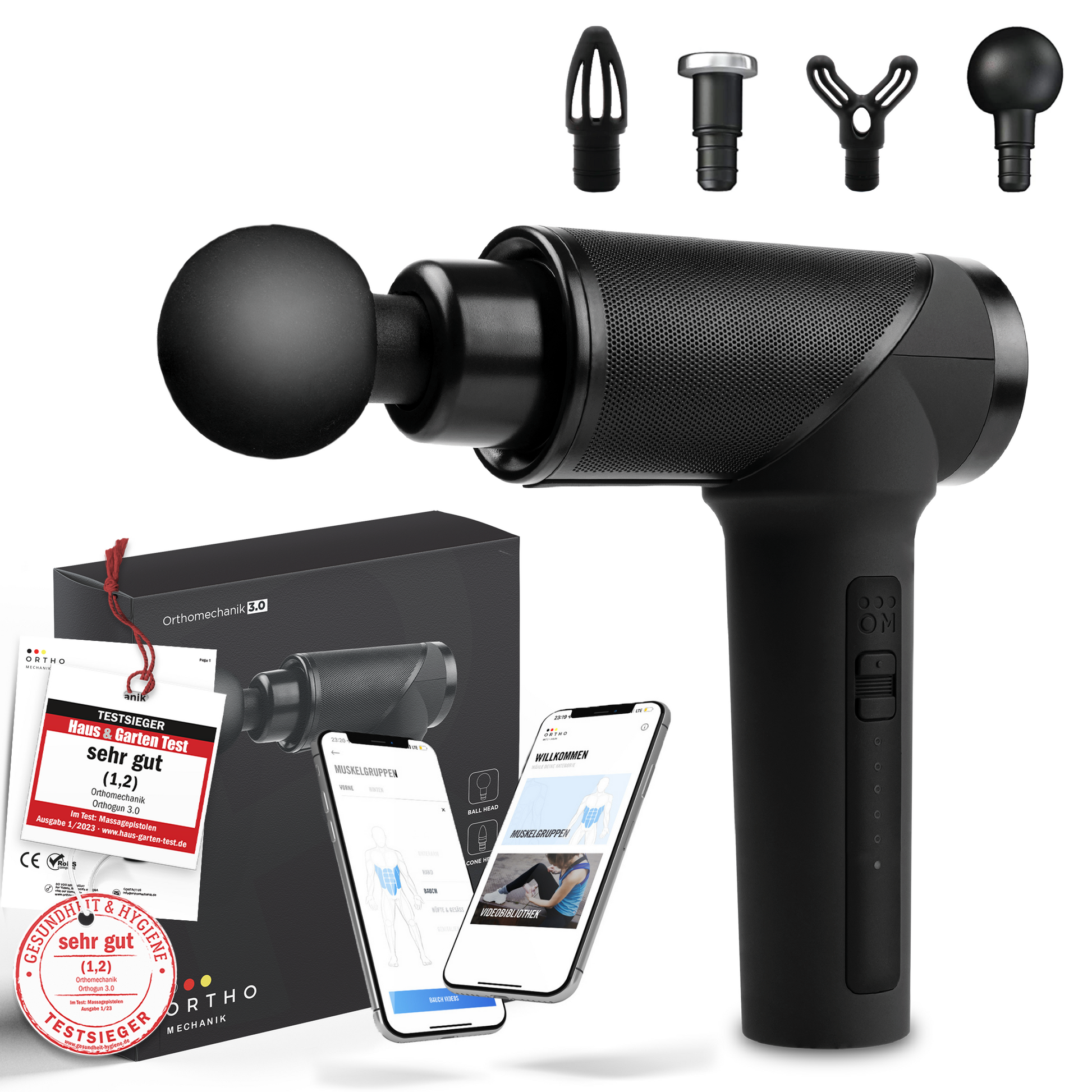 OM-Go 2.0 kompakte Massagepistole inkl. App | Koffer & 4 Aufsätze | OrthoGo 2.0